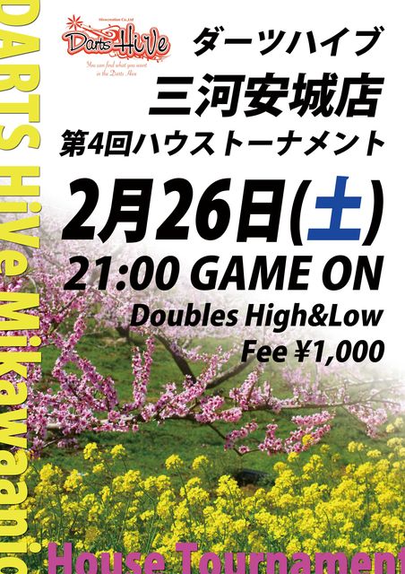 2月のハウストーナメントのお知らせ♪ 第4回は、 2011年2月26日(土) 21:00開始です。 今回は、土曜日夜にやってみようと思います! エントリーフィー1,000円/人(ゲーム代別) ダブルス Hi&Low ゲーム内容:501-Cricket-501 予選ラウンドロビン 決勝トーナメントシングルエリミネーション 優勝、準優勝には、HiVeで使えるHiVeポイントを進呈です(・ω・) ダブルス終了後にオートハンデシングルスをイツモの感じで。 参加人数によって開催するかどうかは場合によりますが、 一度に大量ポイントゲットのチャンスですので、