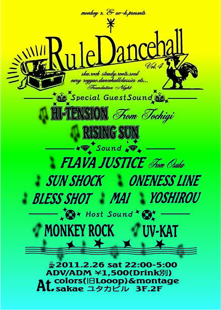 2/26(土) @COLORS(旧@LOOOP) 名古屋市中区栄4-7-17 ユタカビル2F.3F 052-243-3960 http://www.chizumaru.com/maplink.asp?SER=all&D=all&X=492902.52&Y=126589.941&SCL=1060 RULE DANCEHALL Vol.4 〜2FLOOR FOUNDATION NIGHT〜 10pm-5am DOOR.¥1500 (SPECIAL GUEST SOUND) HI-TENSION from TOTIGI RISING SUN (SOUND) FLAVA JUSTICE from OSAKA SUN SHOCK ONENESS LINE BLESS SHOT MAI YOSHIROU (HOST SOUND) MONKEY ROCK UV-CAT ※2Fと3Fの2フロアDANCE。 2FがBAR STYLE、3FがDANCEHALL STYLE。