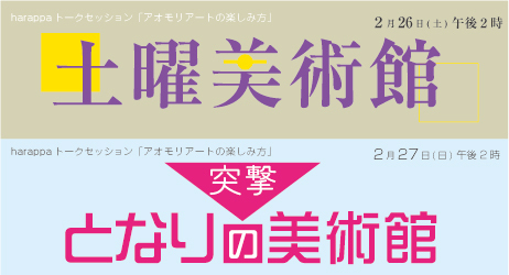 harappaトークセッション アオモリアートの楽しみ方 ○「土曜美術館」 2/26(土) 14:00〜 ○「突撃!となりの美術館」 2/27(日) 14:00〜 会場 弘前市立百石町展示館 弘前市百石町3-2 tel 0172-31-7600 入場無料 http://harappa-h.org/modules/tinyd0/index.php?id=98