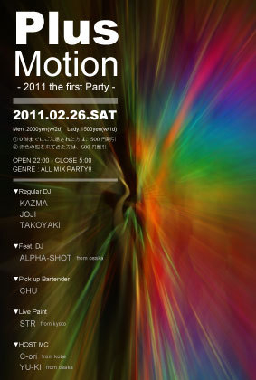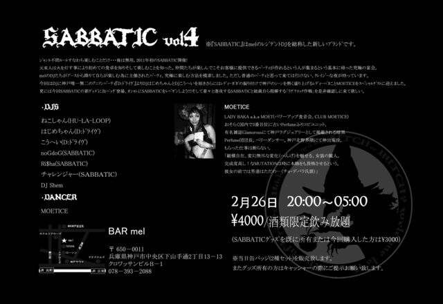 ジャンル不問ルールすなわち楽しむことだけ・・・後は無用。2011年初のSABBATIC開催! 元来人は火を灯す事により初めての食卓を知りそして楽しむことを知った。仲間たちが楽しんでこそお客様に提供できるパー ティが作れるという人が集まるという基本に帰った究極の宴会。melのDJたちがブースから降りて自らが楽しむ為に主催された パーティ、究極に楽しむ方法を模索しました。ただし普通のパーティと思って来ては行けない、クレイジーな夜が待っています。 今回はDJに神戸唯一無二のアニソンパーティ『D:ドライヴ』よりDJはじめち