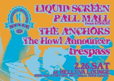 神戸のtrespassです。 本日は自主企画の宣伝をさせて下さい! 02/26(土)神戸HELLUVA LOUNGE(http://helluva.jp/lounge/) trespass presents“Style”vol.32 open18:30 start19:00 adv\1800 door\2300 ●LIQUID SCREEN http://www.myspace.com/theliquidscreen ●PALL MALL(高知) http://www.myspace.com/pallmallkochi ●THE ANCHORS http://d.hatena.ne.jp/teradanchors/ ●The Howl Announcer ●trespass http://www.myspace.com/trespass2 隔月開催自主企画の第32弾! もはや圧倒的と言えるクオリティーの2ndア