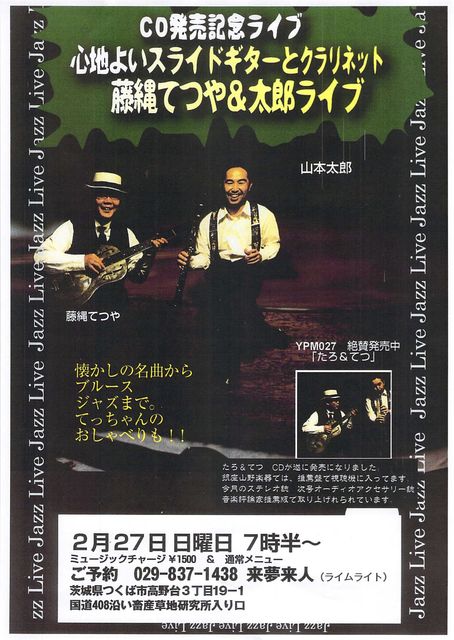藤縄てつや&山本太郎 ☆CD発売記念☆ ジャズライブ 藤縄てつや (ギター、ボーカル) 山本太郎 (クラリネット) 懐かしの名曲から、ブルース、ジャズまで♪ 楽しいおしゃべりも。 昨年末に発売されたデュオのCD「たろ&てつ」 なんと、来夢来人でのライブ演奏も収録されています。 各方面で話題となっているこのCD。 生演奏を聴いて、おみやげにどうぞ(笑) 2月27日 日曜日 7時半〜 ミュージックチャージ1500円 & 飲食代 ご予約 029−837−1438 来夢来人 茶房 来夢来人 茨城県つくば市高野