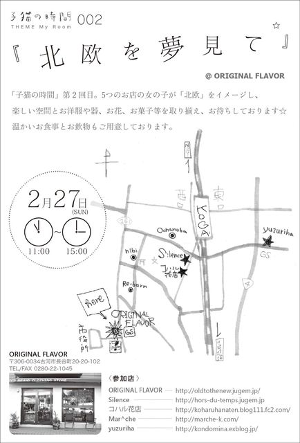 子猫の時間 第2弾決定☆ …◆北欧を夢見て◆… 今回のステージは、市役所近くにできた ブランド古着の買取・販売専門店の 『ORIGINAL FLAVOR』さん!! http://oldtothenew.jugem.jp/ おもいおもいの『北欧』をイメージして 楽しい空間を演出します。*・゚ zehi遊びに来てください♪ 2011/02/27(sun) 『子猫の時間 vol.2』 open/11:00〜15:00 入場無料 古河にお店を持つ女の子が集まって 空間をプロデュースするイベント♪ ≪参加店≫ ・original flavor ・コハル花店 ・Mar^che