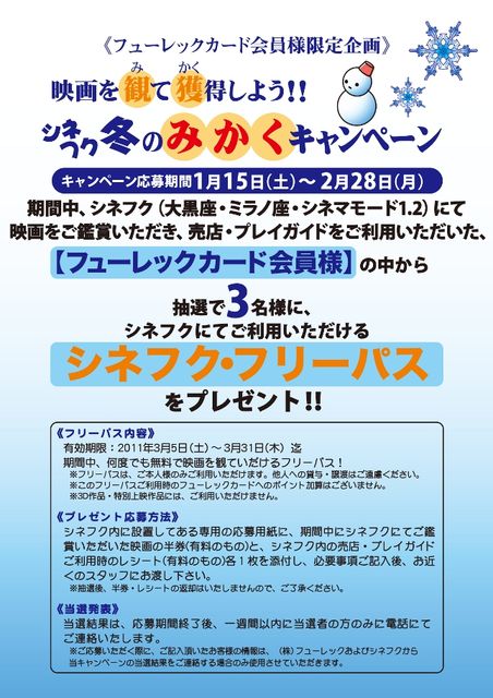 ≪フューレックカード会員様限定企画≫ 映画を“観”て“獲”得しよう!! シネフク冬の「みかく」キャンペーン!! 詳しくはHP参照してください http://www.furec.jp/cinema_topics/topics.php?id=304 期間 : 1/15(土)〜2/28(月) 期間中、シネフク(大黒座・ミラノ座・シネマモード1・2)にて、映画をご鑑賞いただき、売店・プレイガイドをご利用頂いた「フューレックカード会員様」の中から抽選で、 3名様に「シネフク・フリーパス」 をプレゼントいたします。 ≪応募用紙≫ シネフク内に設置してある専用の応募用紙