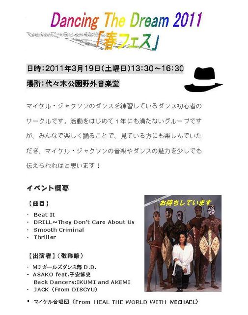 イベント中止となりました >49に中止のお知らせがあります。←3月13日up 参加表明してくださったみなさま、 応援してくださっていたみなさま、 また次回、DDさんと一緒にイベントいたしますので、その時もぜひご参加、応援していただけるとうれしいです よろしくお願いいたします。 ありがとうございました === 『MJガールズダンス部 D.D.』さん主催のイベントに、合唱団も参加させていただくことになりました 参加してくださる方を募集します タイムテーブルは47にあり