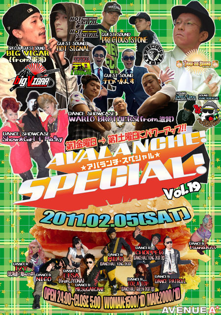 告知失礼します。 毎週水曜日、爆発的な盛り上がりを見せているAVALANCHE WEDNESDAY!!@SAM&DAVE2! が毎月第一土曜日にSPECIALを開催! 場所は大阪アメ村@AVENUE A! イベント詳細 2011年3月5日(土) [毎月第1土曜日開催!!] AVALANCHE SPECIAL vol.20 @AVENUE A 大阪市心斎橋。 ※アバランチ・スペシャルのみ、@KING COBRAから@AVENUE A に移動!! (場所は、大阪心斎橋アメ村@Club JOULEの真裏にあります) ※今回より、毎月第1土曜日開催となります!! ※この日は、朝5時まで!! Special