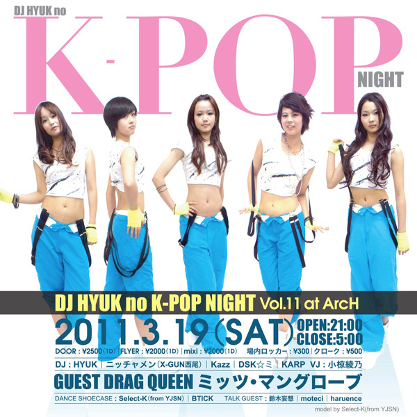 春の足音が聞こえてくる3月のK-POP NIGHTは、 ますますUPPERにお送りします☆ミ DANCE SHOW CASEには、 KARAのカバーダンスチーム「Select-K (fron YJSN)」、 SHINeeのカバーダンスチーム「BTICK」が登場! トークショーには、 日本K-POPシーンのアングラ最先端を駆け抜ける3人をお呼びしました。 3月は全方向対応型でお送りいたします! ●2011年3月19日 (土曜日) 21:00〜5:00 ●場所 ArcH http://www.clubarch.net/ ●入場料 DOOR : 2500円 (1ドリンク付き) with FLYER : 2000円 (1ドリンク付き) h