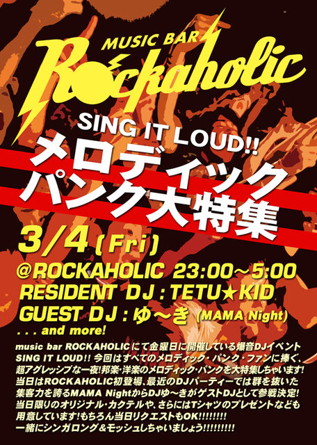 ※2/26追加情報 stack44のヴォーカルを務めるfin氏がSPECIAL GUEST DJとして出演決定!!! stack44オフィシャルWEBサイト(http://stack44.com/disc/) stack44コミュニティー(http://mixi.jp/view_community.pl?id=740642) 非常に貴重なDJになります! 乞うご期待!!! music bar ROCKAHOLICにて金曜日に開催している爆音DJイベントSING IT LOUD!! 今回はすべてのメロディック・パンク・ファンに捧ぐ、超アグレッシブな一夜! 邦楽・洋楽のメロディック・パンクを大特集しちゃいます! 当日はROCKAHOLIC初登場、最近のDJ