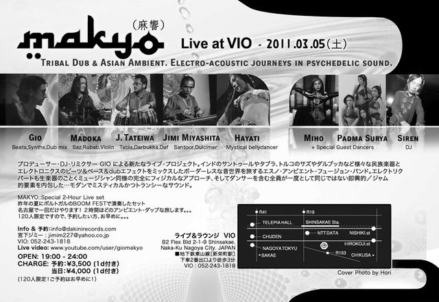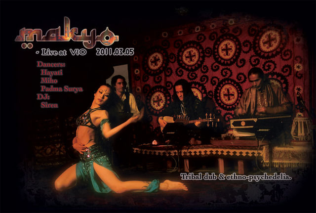 ========================== MAKYO -- Live at VIO Featuring: 宮下ジミー:サントゥール、ダルシマー Madoka: エレクトリック・サズ、ルバブ、バイオリン 立岩潤三:タブラ、ダラブッカ、ダフ Gio: beats, bass, synths, efx, dub mix Hayati: mystical skydancer with special guest dancers: -- Miho (Studio Ritam) -- Padma Surya DJ : Siren ========================== 2011.03.05 (土) @ VIO Open: 19:00 - 24:00 Charge: 予約:\3,500 (1d付き) 当日:\4,000 (1d付き) (120人限定!ご