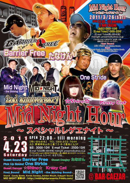 告知失礼します。 Mid Night Hour 〜レギュラーレゲエナイト〜 2011/3/26(Sat) Open:22:00-till morning @BAR CAEZAR 当日:1000-1D付 E-mail Ticket:1000-2D付 E-mail Ticket問い合わせ先:midnight_presents@yahoo.co.jp こちらのE-mail に全日までにお名前、人数、連絡先記入の上メールください。 詳細 Host Sound : Mid Night ~the Shining Sound~ Sound : Candy Bomb,Kendo Sandan,Golden Mouth.Kobushi Sound&friends…