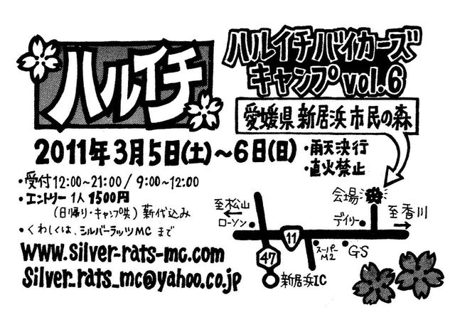 ハルイチ バイカーズキャンプ vol.6 開催日時: 2011年3月5日(土)〜6日(日) 受付(12:00〜21:00/9:00〜12:00) 開催場所: 愛媛県新居浜市船木乙2-1 新居浜 市民の森 参加費: 日帰り、キャンプ共に¥1500(パッチ、ステッカー代込) 主催: Silver Rats mc 問い合わせ先: http://www.silver-rats-mc.com E-mail: silver_rats_mc@yahoo.co.jp 四国で一番最初に開催されるイベントで、 参加すると「その一年無事故でいられる」と噂のキャンプミーティングです。 会