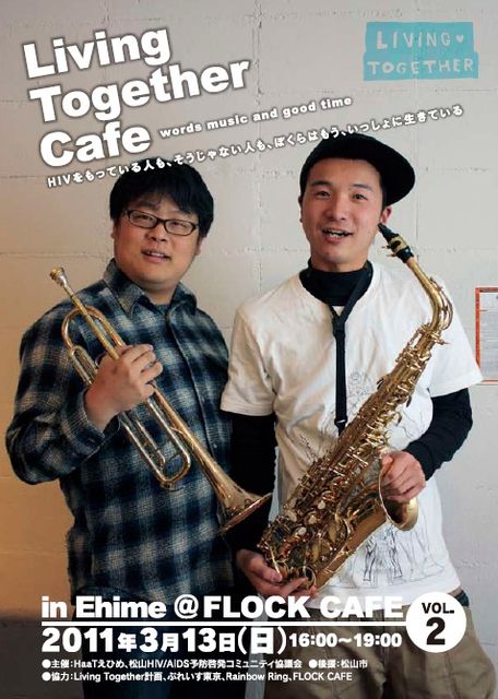 Living Together Cafe in Ehime vol.2(For Gay Only) 日時:2011年3月13日(日)16:00〜19:00(開場15:00〜) 場所:FLOCK CAFE(松山市二番町2-6-5石川ビル3F) http://www1.ocn.ne.jp/~flock/ 料金:入場無料(カウンターでワンドリンク、オーダーしてください) 愛媛県を中心にHIVの活動をおこなっているHaaTえひめが 『HIVをもっている人も、そうじゃない人も、ぼくらはもう、いっしょに生きている』 という「Living Together計画」に賛同してお送りするイベントです。 HIV陽性者やその周囲の人たちの手記を音楽ととも