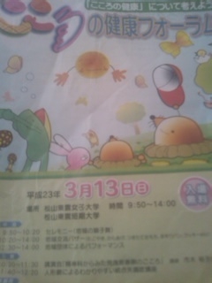 3月11日 日曜日 午前9時過ぎから、松山市主催でこころの健康フォーラムを開催いたします。 こころの健康に関するイベントを行います。 医師による講演会 こころの健康をわかりやすく知ってもらうための人形劇などの啓発活動。 地域の団体や学校などによるイベント。 バザーなどを実施いたします。 松山市にも津波注意報が発令中のため、まだ流動的な部分もありますがよろしくお願いいたします。