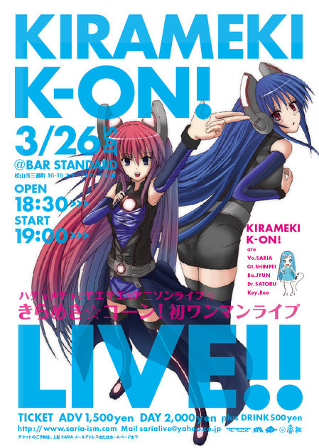 愛媛松山で活動するいろいろなバンドの アニメ好きメンバーで突如、結成された キラメキ☆コーン!!の初ワンマンライブ〜♪ 3月26日(土曜日) 場所 Bar STANDARD 開場 18時30分〜 開演 19時〜 チケット 前売り 1500円 当日 2000円 ドリンク別500円 コスプレ参加も可能です 「けいおん」の楽曲以外に FFの挿入歌やエヴァ、ハルヒ、ボカロのインストなど 王道からマニアな曲までやり