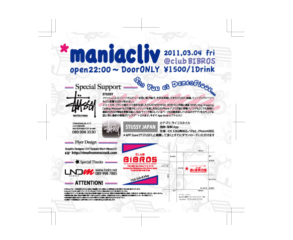 管理人様、告知失礼致します。 "maniacliv" 2011,03/04(fri) @club BIBROS Start 22:00〜 Today's DOOR ONLY \1500/1Drink DJ's TERU & MACO Special Support by......STUSSY matsuyama Flyer Design.......Tadaaki Mori=Rimo http://rimofrommocrock.com -注意事項- *当Partyでは18歳未満の方のご入場はご遠慮願います。場合により顔写真付き身分証をご呈示頂く事がございます。 *Partyにそぐわない格好(ジャージ、サンダルなど)でのご入場はお断りさせて頂く事がございます。 *会場内でのナンパ行