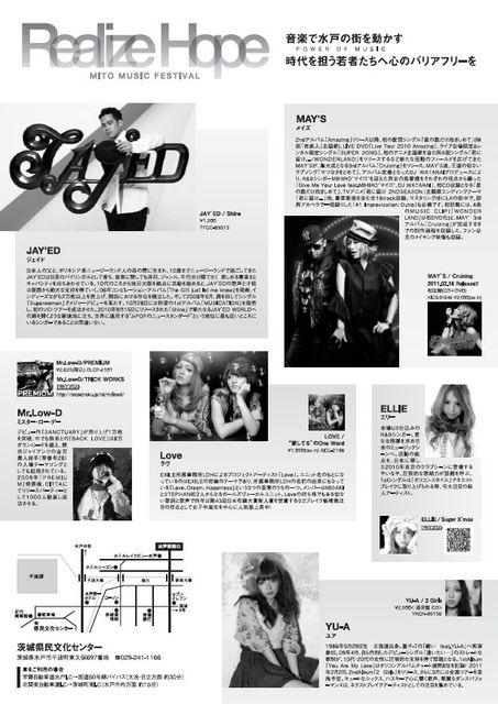 管理人様、告知失礼致します 不適切な場合はお手数お掛け致しますが削除の程お願い致します。 音楽で水戸の街を動かす。 次代を担う若者たちへ心のバリアフリーを ・タイトル 「Realize Hope ~MITO MUSIC FESTIVAL~」 ・開催日時 2011年3月11日(金) 開場18:00 開演19:00 ・開催場所 茨城県立県民文化センター ・出演 MAY'S、JAY'ED、Love、YU-A、Mr.Low-D、ELLIE and more ・オフィシャルHP http://realize-hope.com/ ・チケット 前売り4,000円 当日4,500円 全席指定 先行販売 期間:2月2日(水) 10:00 〜