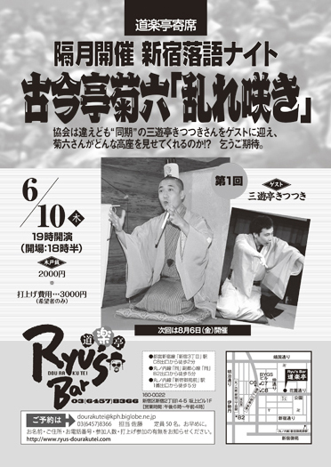 きつつきさんが、菊六さんのゲストとして道楽亭にご出演。 ■道楽亭寄席■ 6月10日(木) 新宿落語ナイト 古今亭菊六【乱れ咲き】 午後7時開演(午後6時半開場) ゲスト:三遊亭きつつき 木戸銭:2000円 打上:3000円(希望者のみ) 歌舞伎役者を思わせる端正かつ豪快な高座姿の陰に……。 秘めたものはいったいナニ!? ゲイの街、新宿二丁目の「芸」の店、道楽亭でしゃべって 飲んで、古今亭菊六がいったい何を咲かすのか! 乞うご期待。 ご予約はhttp://www.ryus-dourakutei.com/ または