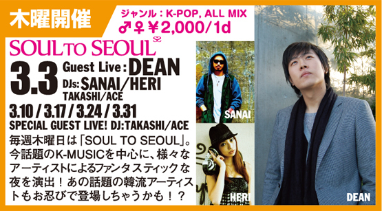 3/3(木)の六本木Lounge OPERASOUL TO SEOULは Guest Live : DEAN Dj : SANAI ,HERI でお贈りします OPEN : 22:00 SYSTEM : 2000/1D mixi見たで1500/1D お待ちしております