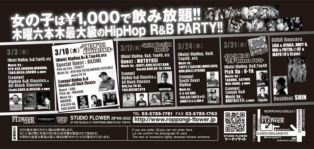 管理人様告知失礼します。 六本木 Studio FLOWER毎週木曜日 3/3(Thu) "FRESH" -Renewal Open Special vol.3- 毎週木曜日、女性飲み放題の人気パーティー です! そして東京のCLUBSCENEをリードするお洒落で最先端な街・六本木地区に位置する 『Studio FLOWER』 この度装い新たにリニューアルOPENを致しました!!! ■FLOWERで唯一のBlack Music Onlyのイベント! *Main Floorは最新曲, TOP40中心のHipHop, R&Bフロア! *Lounge Floorは90s HipHop 90s R&B Dance Classics などなど... ■今回はひな祭りSpecialという事もあ