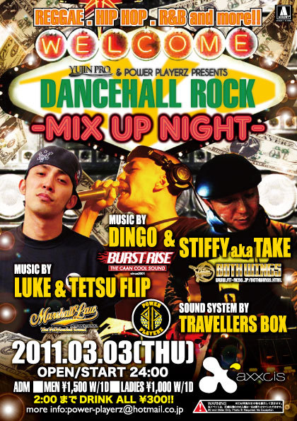 3/3(Thu) ★Every 1st Thursday★ YUJIN PRO.&POWER PLAYERZ PRESENTS DANCEHALL ROCK TYO -MIX UP NIGHT- @AXXCIS -GENRE- REGGAE HIPHOP R&B and more!! -OPEN- 0:00 -ENTRANCE- MEN ¥1500/1d LADIES ¥1000/1d 2:00までDRINK ALL¥300!! -MUSIC BY- DINGO fr.BURST RISE & STIFFY a.k.a TAKE fr.BOTH WINGS LUKE fr.MARSHALL LAW & TETSU FLIP fr.POWER PLAYERZ -SOUND SYSTEM BY- TRAVELLERS BOX ☆life is a gamble! 温故知新!何が起こるかわからない、東京で一番ドキドキできるparty。 月の始めの「