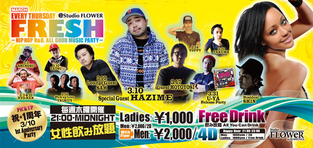 告知失礼します。 ★★★★★★★★★★★★★★★★★★★★★★★★★★★★★ ■ゲストをご希望の方へ... お名前を明記の上、お気軽にメッセージください!!! ★★★★★★★★★★★★★★★★★★★★★★★★★★★★★ 六本木 Studio FLOWER毎週木曜日 3/3(木) "FRESH" ■『FRESH』では女性は\1000飲み放題♪ ■FLOWERで唯一のBlack Music Onlyのイベントです! DJには六本木FLOWERからDJ SHIN、 その他、渋谷、六本木を中心に活躍中の間違いないDJ陣でがっつり盛り上げます! ■全フロア開放していま