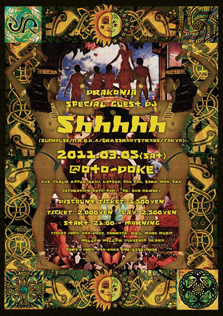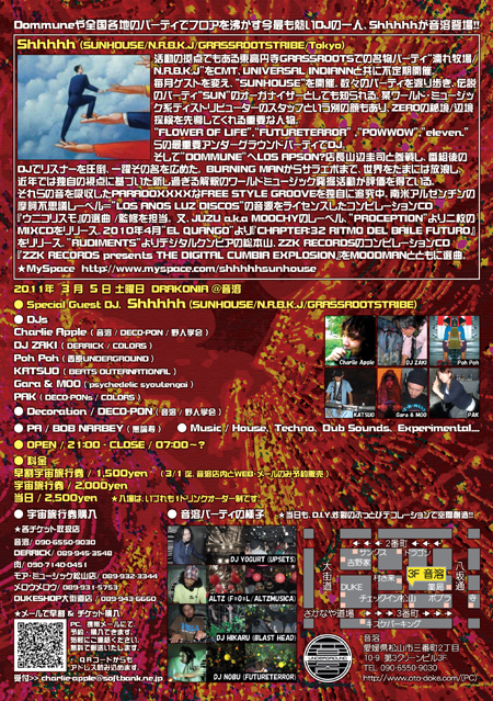 管理人様告知失礼致します。 ワールドミュージックの新解釈で、Dommuneをはじめ全国各地のパーティでフロアを沸かす今最も熱いDJの一人、Shhhhhがついに音溶登場!!最高最狂の音とD.I.Y精神爆発のぶっ飛びデコで新境地へご案内致します!!! ■2011.03.05(sat) DRAKONIA @音溶 ■Special Guest Shhhhh (SUNHOUSE/N.R.B.K.J/GRASSROOTSTRIBE) ★Shhhhh (SUNHOUSE/N.R.B.K.J/GRASSROOTSTRIBE/Tokyo) 活動の拠点でもある東高円寺GRASSROOTSでの名物パーティ “濡れ牧場/N.R.B.K.J”をCMT、UNIVERSAL INDIANNと共に不定期開催。毎月ゲスト