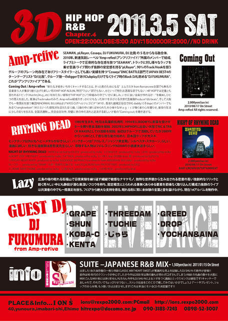 いよいよ明日です!! THREEDAM PRESENTS■3D chapter.4■ 今回も間違いない面子で楽しませます!! 是非!!! ■3D chapter.4■ 2011/03/05/sat 今治湯浦I ON,S OPEN:22:00 CLOSE:5:00 ADV:1500 DOOR:2000 (NO DRINK) GUEST ・Amp-refive(大阪) ・RHYMING DEAD(大阪) ・LAZY(福山) LIVE ・THREEDAM ・TUCHIE ・じゃら DJ ・GRAPE(松山) ・SHU-N(松山) ・KOBA-C ・KENTA DANCE ・GREED ・DROP(松山) ・YOCHAN&AINA(松山) SUPORT SHOP FIG CLOTHING(大阪十三)
