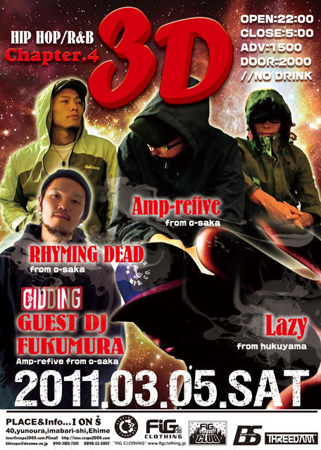 FIG CLOTHING IN DA CLUB >> THREEDAM Presents 『3D Chapter.4』 2011.03.05(SAT)at ION'S OPEN:22:00 CLOSE:5:00 ADV:1500 DOOR:2000 (NO DRINK) GUEST LIVE >> Amp-refive from 大阪 RHYMING DEAD from 大阪 LAZY from 福山 DJ >> GRAPE(松山) / SHU-N(松山) / KOBA-C / KENTA MC >> THREEDAM / TUCHIE / じゃら DANCE >> GREED / DROP(松山) / YOCHAN&AINA(松山) SUPORT SHOP >> FIG CLOTHING(大阪十三) http://www.figclothing.jp また行くYO〜!!笑 今年一発目のin 愛媛!! お馴染みのTHREEDAM Presents