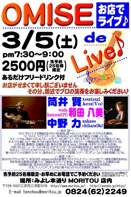 http://www.moritou.jp/omise_de_live.htm#poster 今回で「お店でライブ」は何回目になるのか・・・・! いよいよ重鎮kenさんに歌っていただきます!! ピアノははっちゃん!!! 楽しみです。 どうぞ、皆様お越しをお待ちしております♪ ※管理者さま、宣伝ありがとうございました。