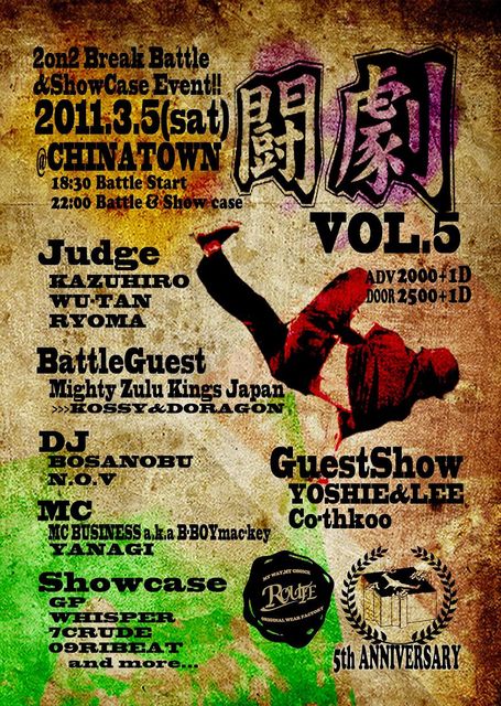 闘劇-tougeki-第五幕 2011年3月5日 土曜日 @CHINA TOWN 広島市中区銀山町 OPEN>> 17:30〜 START>> 18:30〜 【予選】 22:00〜 【本戦&SHOW CASE】 ADV \2,000+1D DOOR \2,500+1D BATTLE ENTRY \2,000 >>JUDGE ★KAZUHIRO 【ALL AREA/O.G.S】 ★WU-TAN 【AIRREAL/masterpeace/crows ensemble/incline】 ★RYOMA 【MOTAL COMBAT】 >>MC ★MC BUSINESS aka B-BOY mac-key 【FLOOR FRI-ENDS/ex鎌倉FM/THE BUSINESS】 ★YANAGI >>DJ ★BOSANOBU 【京都B-BOYCREW】 ★N.O.V