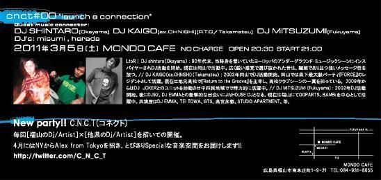 C.N.C.T #00 "launch a connection" 〜C.N.C.T(コネクト)〜 毎回各地から様々なDJ・アーティストを招き 「音楽×人」の新たな広がりを!! Connect the beats, music, mind, people and lives !! ▶ 開催日時 : 2011年3月5日(土) OPEN 20:30 START 21:00 ▶ 開催場所 : MONDO CAFE (広島県福山市南本庄町1-9-21 TEL:084-931-8655) ▶ 入場料金 : FReeeeeeeee..............NO CHARGE!!!!!! ▶ GUEST DJ : SHINTARO (Okayama) KAIGO(ex.OHNISHI) (R.T.G / Takamatsu) MITSUZUMI