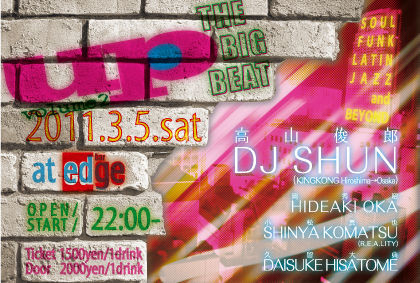 管理人様 告知失礼致します。 今週末、広島クラブ界の黎明期を支えた、元キングコング広島店代表シュンさん&キング・オブ・レアグルーヴ岡さんがエッジでDJします!凄い夜になりそうです。是非遊びにきてください!!! 2011.3.5.sat at Bar edge " UP volume2 " DJ`s:DJ SHUN (KIngKong Hiroshima→Osaka) Hideaki Oka Shinya Komatsu(Hybrid Boogie) Daisuke HIsatome OPEN:22:00 DOOR:2000yen (1D) / Ticket:1500yen (1D)