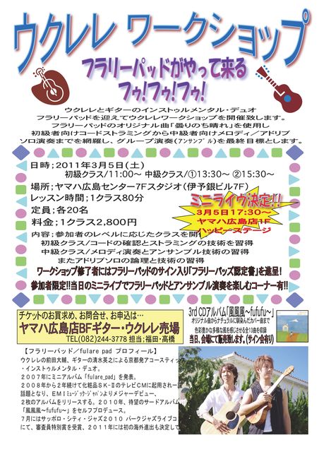 フラリーが今年から始動させた「スマイル・プロジェクト」では、日本中に笑顔が広がるようにとの願いをこめ、フラリーと一緒に音楽を楽しむ仲間「フラリーパッズ」を全国にて募集します! フラリーパッズになる条件は、フラリーが提供するウクレレのワークショップに参加することだけ。 初心者でも楽しく演奏できるよう、フラリーの二人が親切丁寧に指導していきます。 一人よりも仲間と弾くのがウクレレは一番! みんなで演奏すれば気分は「曇りのち晴れ」。 第一回目のメンバー募集は広島です。 初級者向け、中級者向けとクラス分けされて