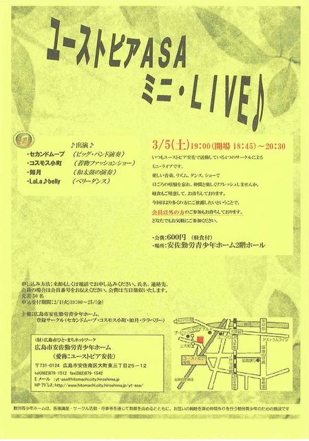 ユーストピア安佐で活動する4サークルによるミニライブ。 <出演> セカンド・ムーブ(ビッグバンド) コスモス小町(着物着付け) 如月(和太鼓) LaLa♪belly(ベリーダンス) <入場料> 600円(軽食付)