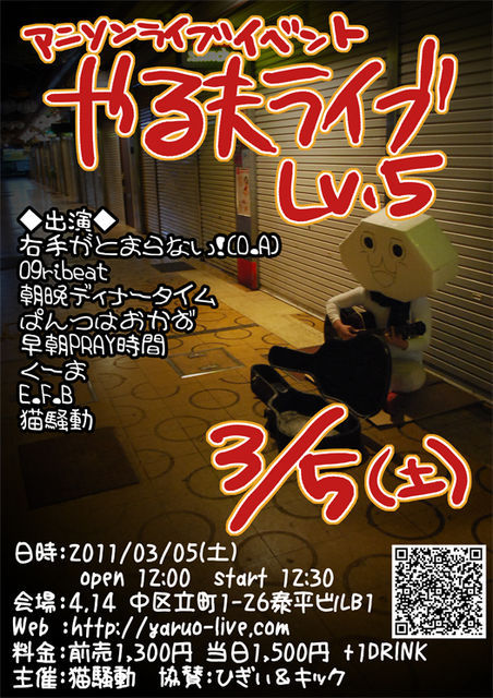 ついにLv5!3月5日は広島燃やす! ◆ライブ ━━━━━━━━━━━━━━━━━━━━━━━━━━━━━━ やる夫ライブ Lv5 〜どうしてこうなった〜 ・開催日:2011/03/05(土) ・OPEN→12:00 START→12:30 ・会 場:4.14 中区立町1-26泰平ビルB1 (http://hiroshima414.com/) ・出演 ぱんつはおかず / 09ribeat / 朝晩ディナータイム / 早朝PRAY時間 くーま / E.F.B / 猫騒動 / O.A 右手がとまらない! ・前売:1,300円 当日:1,500円 (+1DRINK Order) ・主催:猫騒動 ・協賛:ひぎぃ&キ
