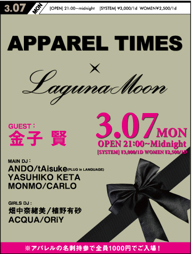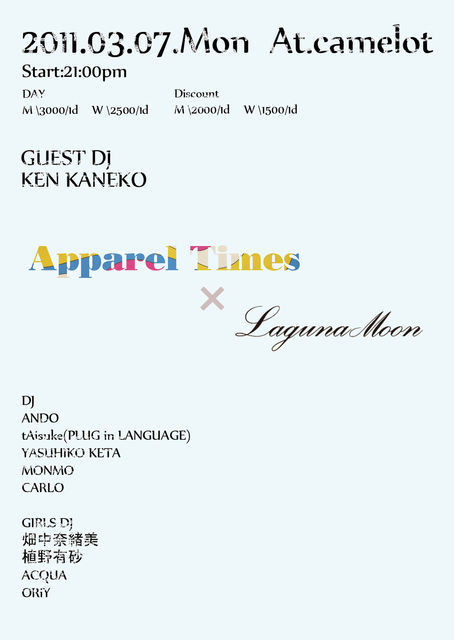 有名ショップ店員やモデルが集まるキャメロットでも客層NO1イベント アパレル業界のに興味がある方や、業界の方々の出会いや交流を深めたい方も是非参加して下さい お洒落さんいっぱい集まれ〜 前回は何と平日にして500人の人で賑わいました 今回は大人気アパレルブランド≪Laguna Moon≫と合同開催 更にはゲストDJに、俳優、格闘家、DJと、多方面に大活躍の金子賢が登場 音楽を楽しみたい方も大歓迎 キャメロットレジデントDJのAndoをはじめ、都内などで活躍しているDJが盛り上げます