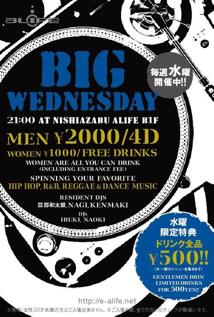 DJはジャンルにとらわれず、あなたの好きな曲をスピン!楽しいお酒、音楽、出合いを大切に、BIG WEDNESDAYクルーが、素敵な一夜を演出します。