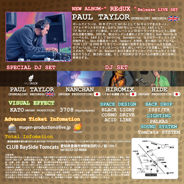 大英帝国トランスシーンが誇る重鎮、DJ PAUL‘THE KILLER’TAYLOR 。彼は96年、聖地ゴアにてその輝かしいキャリアをスタートさせる事になる。英国でレコードショップを営む傍らDJとして他の追随を許さぬ圧倒的な速度での進化を遂げた彼は00年、その実力をいち早く見出したRaja Ramの強い誘いを受けTIP. WORLDにレーベルDJ兼A&Rとして加入、こ