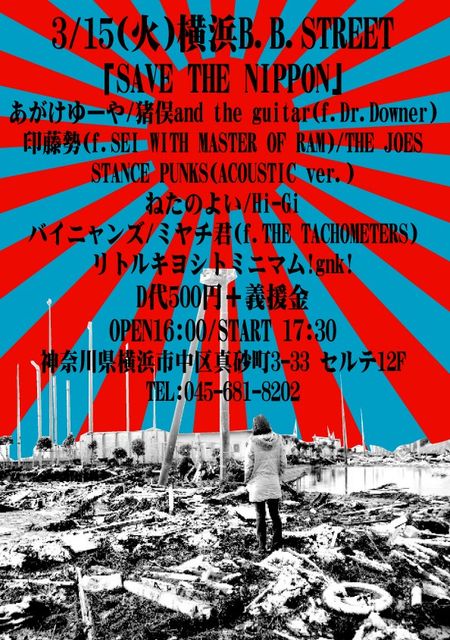 3/15(火)横浜B.B.STREET 「SAVE THE NIPPON」 猪俣and the guitar(f.Dr.Downer) / THE JOES ミヤチ君(f.THE TACHOMETERS) / 印藤勢(f.SEI WITH MASTER OF RAM) バイニャンズ / ねたのよい / あがけゆーや / STANCE PUNKS(ACOUSTIC ver.) Hi-Gi / リトルキヨシトミニマム!gnk! D代500円+義援金 OPEN16:00/START 17:30 神奈川県横浜市中区真砂町3-33 セルテ12F TEL:045-681-8202