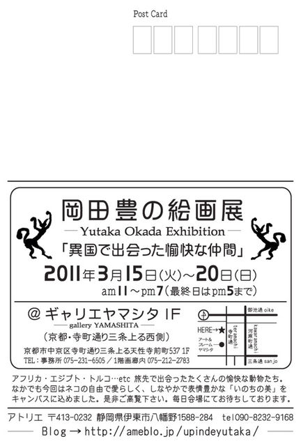 ギャラリー take twoにて、15人展を開催中です。 まだまだ有名でないギャラリーですが京都市役所の近くでやっています。 ギャラリーをみがてら私達の作品を見にきませんか?? 日時*2011/3/15〜3/20 11:00〜19:00(最終日は17:00) 場所*TAKE two 京都市中京区御幸町通御池上ル亀屋町399 カーサ御幸1F 地下鉄東西線「市役所前駅」 ゼスト御池10番出口より御幸町通を北へ100m 人通り少ない所なので、どんどん見にきて下さい。