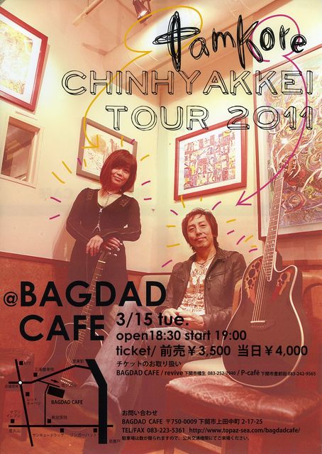 下関で毎年ライブ開催をしている『タムコレ』が、今年もやってきます。 今年の会場は、話題の古民家カフェ BAGDAD CAFE (下関市上田中町2-17-25/TEL 083-223-5361) 日時は、2011年3月15日(火)/開場18:30・開演19:00 チケットは、前売り3,500円・当日4,000円 発売箇所 BAGDAD CAFE/P−cafe(豊前田)/revaive(幡生) ちなみに、駐車場はゴクゴクわずかなので、公共の交通機関でお越し下さい。 バス停は、新町三丁目・上田中町青莪が便利です。 席数に限りがありますので、チケットはお早めに