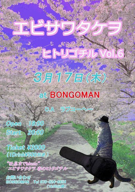 ライブ告知させていただきます 3月17日(木) エビサワタケヲ 〜ヒトリゴチルVol.6〜 オープン 18:00 スタート 20:00 (O.A ラブコーヘー 19:30〜) チケット \2000 (1ドリンク\500別途) エビサワタケヲ4度目のBONGOMANです。 今回はO.Aにラブコーヘーくんを迎えることになってます 席に限りがありますので迷い中の方はお早めにです 問い合わせ BONGOMAN Tel 078 924-6654 (19:00以降)