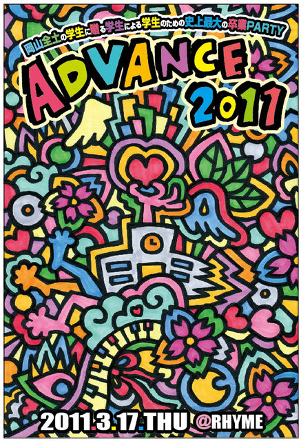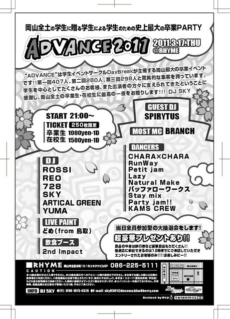 告知、失礼いたします!! 学生クラブイベントオーガナイズサークル「DayBreak」の ノートルダム清心女子大学4年の佐々木由真です。 このたび、岡山県下全ての学生を対象に 卒業イベントを行うことになりましたので お知らせいたします☆ −学生による学生のためのイベント− 「卒業パーティー」ADVANCE2011!! 過去には400人超えも記録した伝説のイベントです。 昨年はタウン情報岡山の取材も入り、年々知名度も上がり 春の定番イベントと化していましたが・・・ じつは私たちDayBreakは メンバーの大学卒業のため