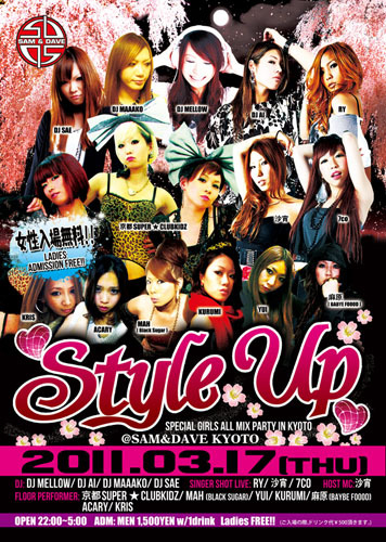 管理人様貴重なスペース ありがとうございます。 告知失礼します。 SAM&DAVE KYOTO、 毎月第3木曜日恒例の 『Style Up』!!! 出演者はみんな 女!!!です\(^O^)/ 女たちが朝までがっつり 盛り上げます☆ 今回のテーマは 『夜桜』ということで、 フロアもいつもよりも 華やかにして お待ちしております! ひと足早い桜を 一緒に楽しみましょう♪ そして今回も、 女性は入場無料!!!!!!! 出演者が女ばっかりなので、 女性の方も遊びに来やすい イベントになってます(^O^) ぜひぜひ、フロアをもっと 華やかにしに来てください! で