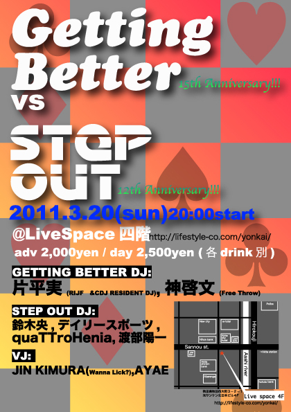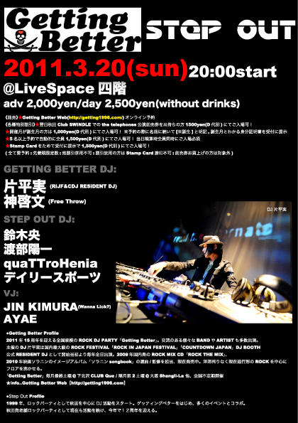 今回は東京からGETTING BETTER DJ 片平実氏、神啓文氏を招待し、vs企画でやらせて頂きます!ロックインジャパンフェス、カウントダウンジャパンフェスに行かれたことのある方はご存知の方もいるのではないでしょうか?日本を代表するロックDJが、まだまだ寒い秋田を沸かせてくれる筈!みなさん、是非ふるってご参加ください!