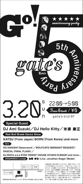 DJ Ami Suzuki、DJ Hello Kitty、米原康正など豪華ゲストが3月20日(日)にGate's(ゲイツ)5周年パーティで福岡にやってきます!