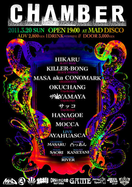 最後のサッコ食堂祭り 特攻編 爆弾投下!!! ▲▼CHAMBER▼▲ 2011/03/20 @MADDISO (morioka) ADV 2800yen/1d DAY 3000yen 先着50名にはwelcome SMIRNOFF!! 19:00start ▲▼▲▼▲▼▲▼▲ HIKARU (blasthead) http://www.lastrum.co.jp/blast/ KILLER-BONG (black smoker) http://www.blacksmoker.net/ MASA akaCONOMARK (grassroots) http://conomark.exblog.jp/ http://www.grassrootstribe.com/ ▲▼▲ Okuchang (Cope&chips) ザ☆Yamaya (Cope&chips) サッコ (Cope&chips) Hanago