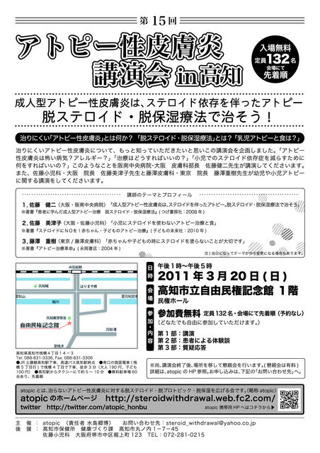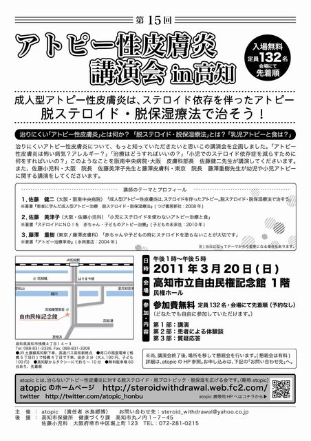 管理人さま 告知失礼します。 来月3月20日に高知市で脱ステロイド脱保湿治療で有名な佐藤健二先生と患者がたちあげたatopicによる講演会があります。 なかなかない機会だと思います。無料・予約なしですのでどうぞお気軽にお越しください。 ************************* 第15回 アトピー性皮膚炎 講演会 in 高知 2011年 3月20日(日)開催 成人型アトピー性皮膚炎は、ステロイド依存を伴ったアトピー 脱ステロイド・脱保湿療法で治そう! 治りにくい「アトピー性皮膚炎」とは何か? 「