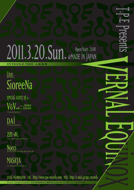 3月20日(sun)入場無料★町田★T.P.E PRESENTS -VERNAL EQUINOX- Open/Start: 21:00〜06:00 MADE IN JAPAN (町田駅 南口) ENTRANCE FREE 入場無料 ☆入場料は不要ですので 満足して頂いた気持ちで 募金に ご協力くださいませ。 全額寄付金になります ☆こちらの団体では すでに物資 募金集めて 活動開始しています。 men's eggモデル しおりーな SioreeNa LIVE: http://ameblo.jp/ikeda-shiori/ http://www.youtube.com/watch?v=OFx121k2Ipo ★SPECIAL GUEST DJ s:: V&V with Guita