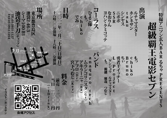 またやりますよ〜 超 級 覇 王 電 影 7 !!! 大人げない大人のガチンコエンターテインメント! 2011年3月20日(日) 【開場】18:00 【開演】18:30 【場所】池袋 手刀(Chop)http://www.chop.jp/ 【チャージ】前売¥2000+1ドリンク(¥500) 当日¥2300+1ドリンク(¥500) 【L project】 つむじ・ゲンジョウ・髑髏・雅哉・もっ・ルチャマスター ♪最後の方でやるアレ 【SSR】 ♪アニメがなんだ - 山本正之 【シンヤス】 ♪JAP - 戦国BASARA 【taku】 ♪ル